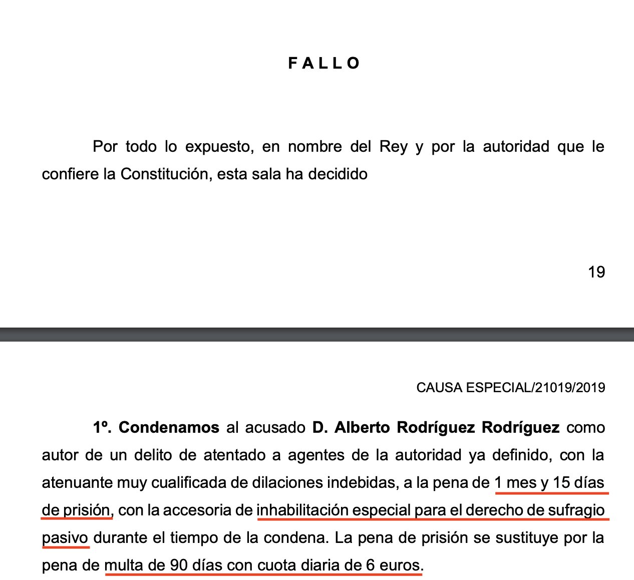 2.- Rodríguez fue condenado a pena de prisión de un mes y 15 días, sustituida por multa, y a inhabilitación especial para el derecho de sufragio pasivo. Esta sentencia podía tener dos tipos de efectos, uno directo en la esfera penal y otro indirecto en la parlamentaria. pic.twitter.com/Tit3RLAoRR